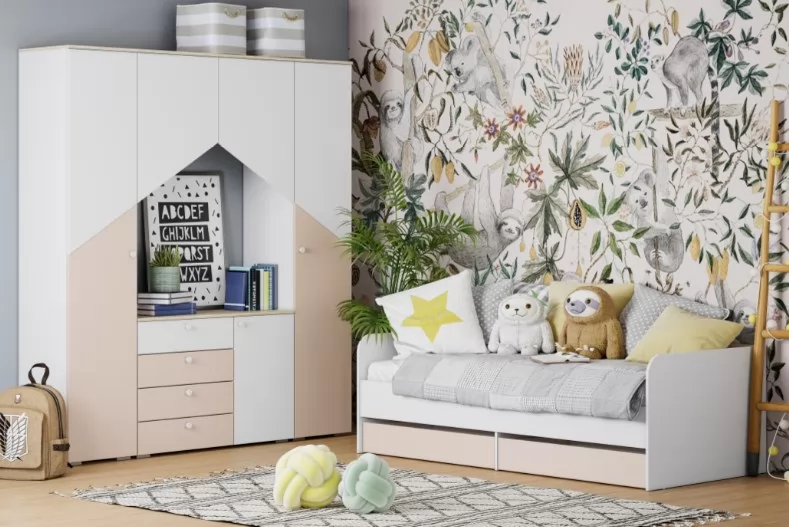 Особенности стиля детской «Банни» - это: светлые, спокойные оттенки в единой гамме. Скругленные ручки-кнопки не имеют острых граней. Ящики для хранения белья позволят навести порядок в комнате и расположить вещи. Скандинавская стилистика не любит загромождения мебелью. Только функциональность и практичность. Если правильно спланировать интерьер, в детской будет много места для хранения и пространства для игр. Фасады выполнены из МДФ с покрытием пленкой ПВХ.