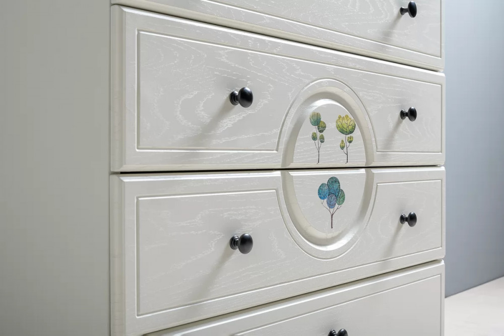 Комод Роуз 13.297 прекрасно впишется в интерьер детской комнаты, а также привнесет яркие нотки. Теперь у ребенка появится дополнительное место для бережного хранения одежды и нижнего белья, разнообразных аксессуаров и игрушек. Комод оснащен четырьмя выдвижными ящиками. Сверху на комоде можно разместить несколько памятных фотографий и оригинальные предметы декора. Декор и рисунок на фасадах способствуют созданию сказочной атмосферы.