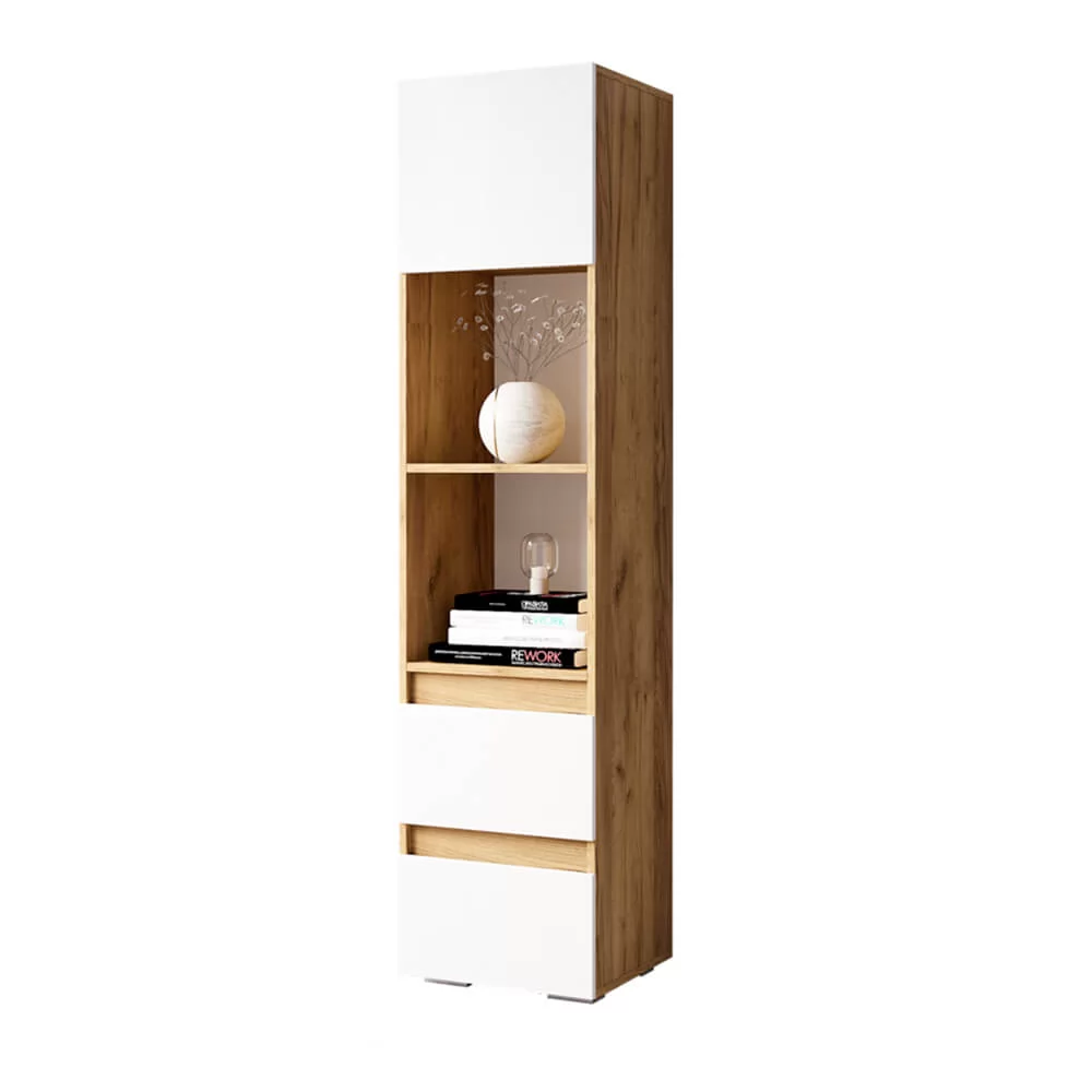 -модель представляет собой открытые полки, верхнее отделение с распашной дверцей и два нижних выдвигающихся ящика,