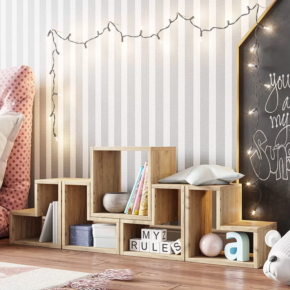 Такой прием позволит вам организовать дополнительное место хранения для книг и предметов декора в любой комнате. Модель выполнена из ЛДСП под натуральное дерево, ее можно крепить на стену, а можно и разместить на полу.
