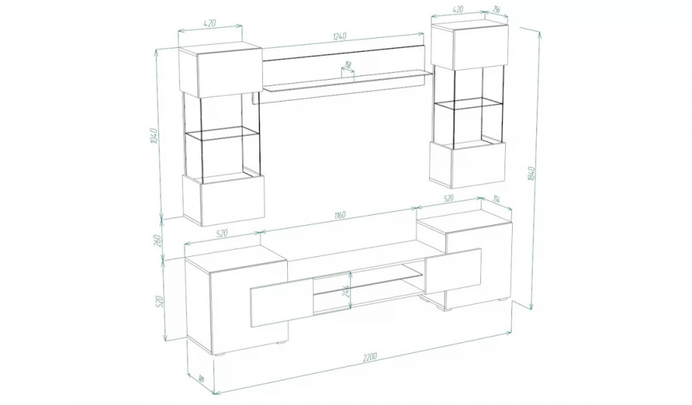 • Ниша под ТВ: 1160 мм при размещении ТВ на тумбе.