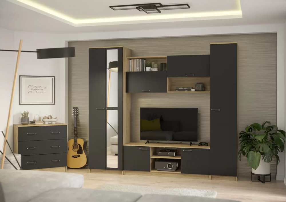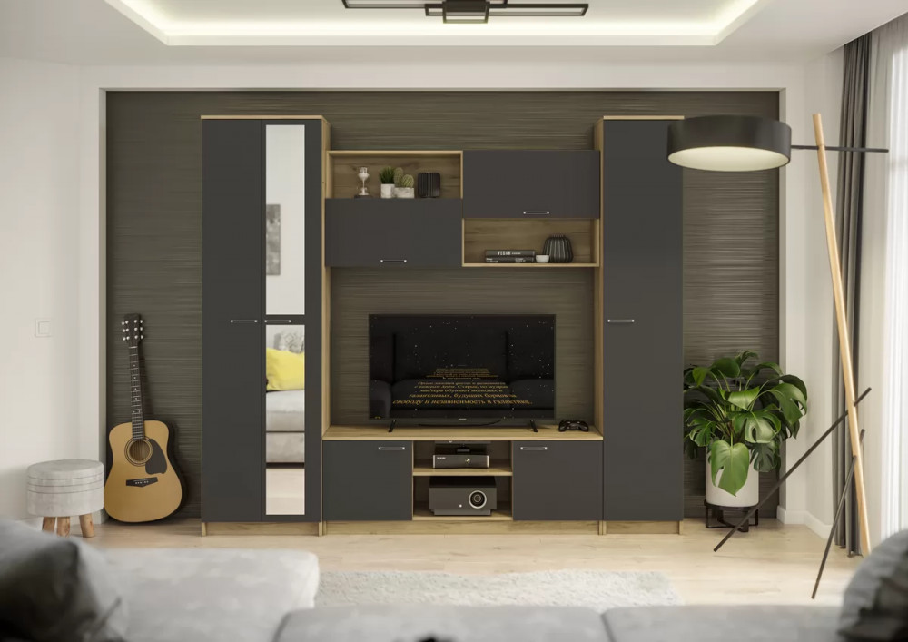 Многофункциональная и практичная гостиная выполнена в современном дизайне - Гостиная состоит из бельевого шкафа, средней секции и платяного шкафа - Размер тумбы под ТВ (ШхВхГ): 1400х500х420 мм, Ниша под ТВ: 1400х830 мм для моделей телевизоров с диагональю до 43" - Размеры платяного шкафа (ШхВхГ): 600х2100х450 мм, Платяной шкаф комплектуется выкатной штангой - Размеры пенала (ШхВхГ): 400х2100х420 мм - Зеркало 4 мм - Ручка пластик - Сборка универсальная, собирается как на левую, так и на правую сторону Монтаж зеркал к фасадам производится на фабрике.