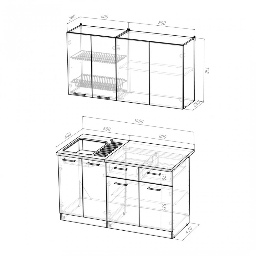 Мойки, смесители и посудосушители в комплекты гарнитуров не входят.