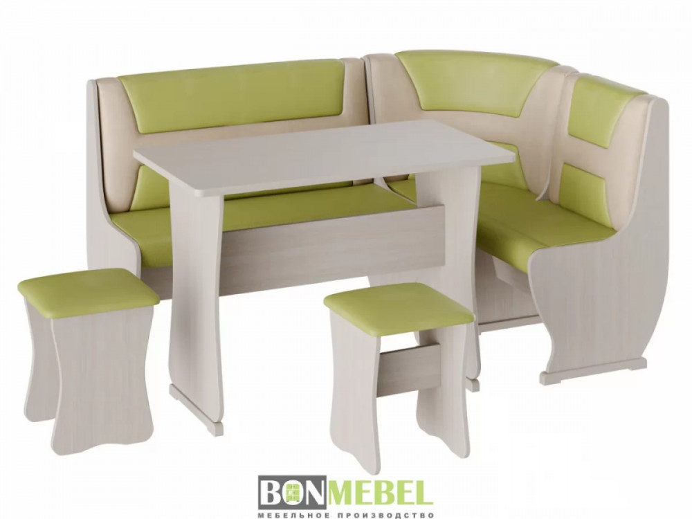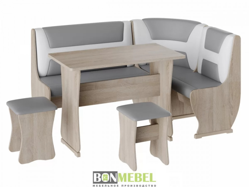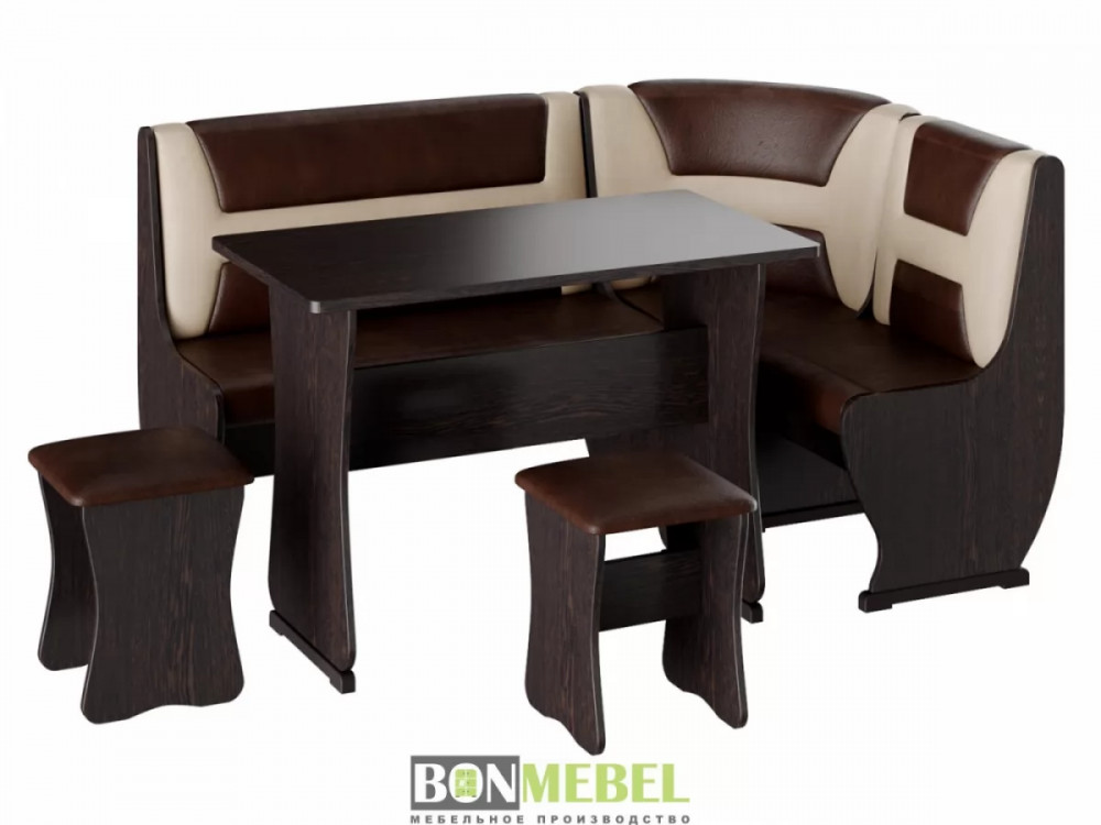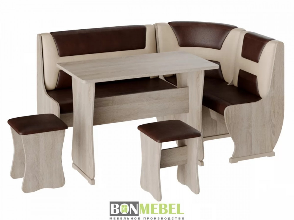 Приятный глазу уголок Уют тип 3 организует даже на небольшой кухне уютное место для приема пищи. В комплекте представлено все необходимое для этого, а именно: угловой диван, две табуретки и обеденный стол. Отличная комплектация позволяет разместить всю семью за столом. Обивка из экокожи легко чистится. Удобное хранение — конструкция дополнена вместительными ящиками. Компактный размер — поместится даже в небольшой кухне.