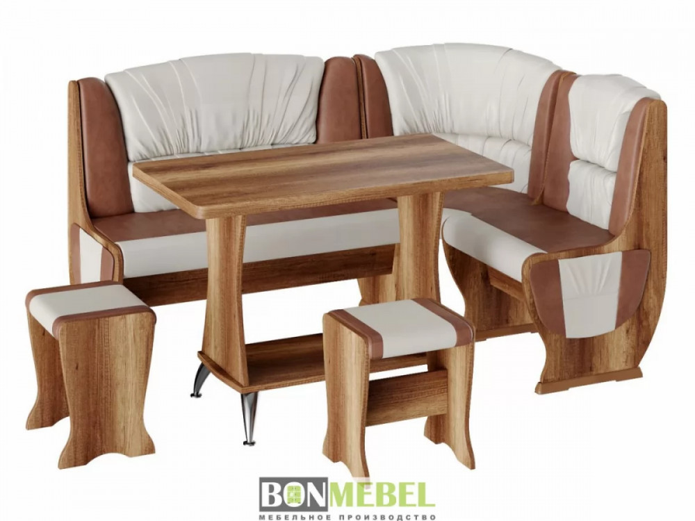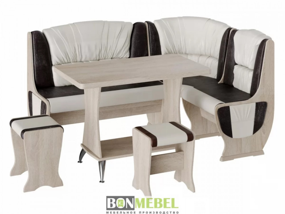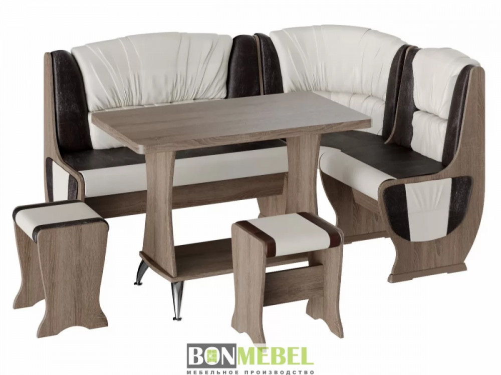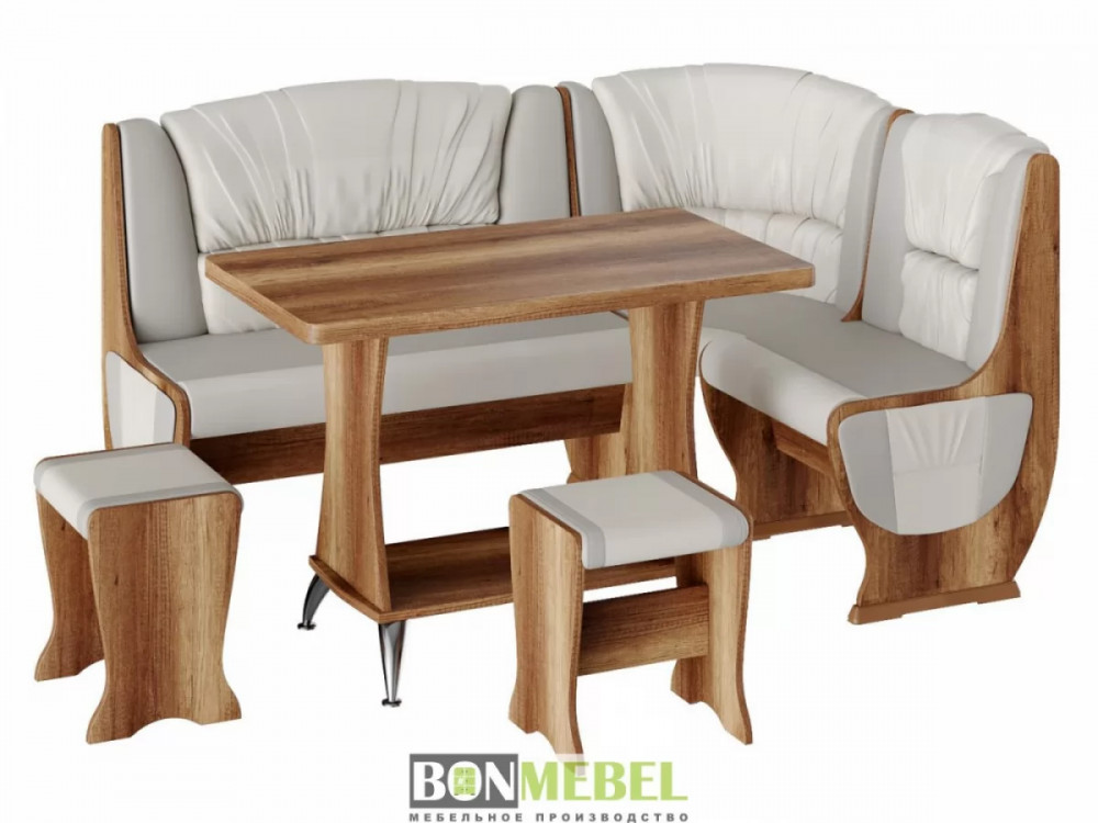 Мягкий уголок для кухни с оригинальной обивкой добавит уюта кухонному интерьеру. Особенно понравится такая модель тем, кто любит долгие посиделки с семьей или друзьями за чаепитие. Сборка скамьи универсальная — вы можете определить угол как с правой, так и с левой стороны. Скамья дополнена двумя ящиками под сиденьем. Обивка на табуретах и скамье выполнена из искусственной кожи с наполнителем из поролона. Каркас изделий изготовлен из ЛДСП, на ножках установлены пластиковые накладки.