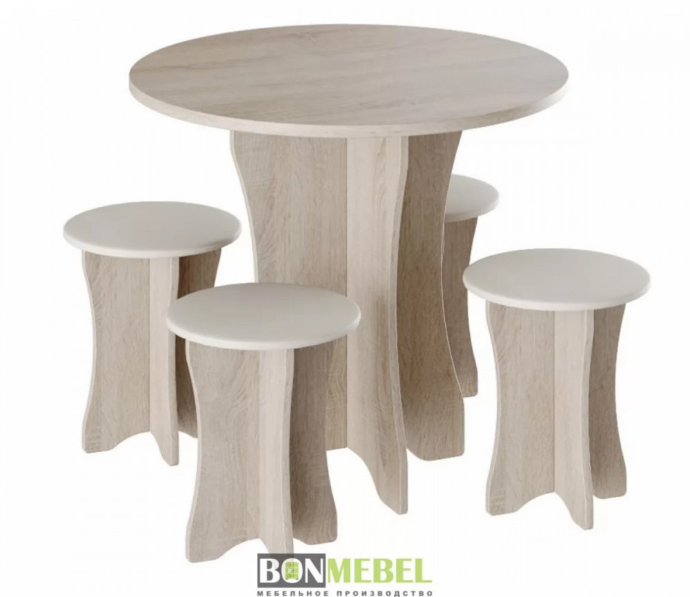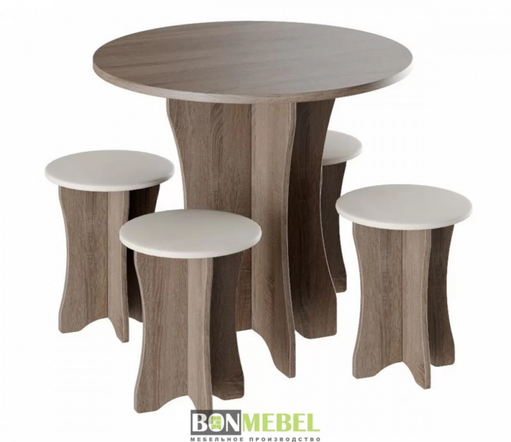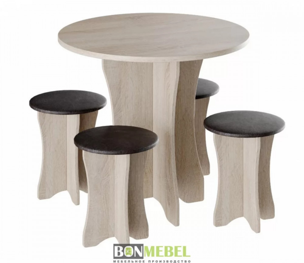 Обеденная группа Тип-6 отличается простым, но привлекательным стилем. Композиция без труда вольется в любой современный интерьер, сделав кухонное пространство более практичным и уютным. Обивка из экокожи обладает износостойкостью, устойчивостью к загрязнениям и не прихотлив в уходе. Мягкие сиденья табуретов имеют мягкий и упругий слой, что создает максимально комфортные условия для сидящего. Классическое контрастное сочетание цветов сделает любой интерьер интересным и гармоничным. Для изготовления моделей используется прочная ЛДСП. Обивка табуретов произведена из искусственной кожи.