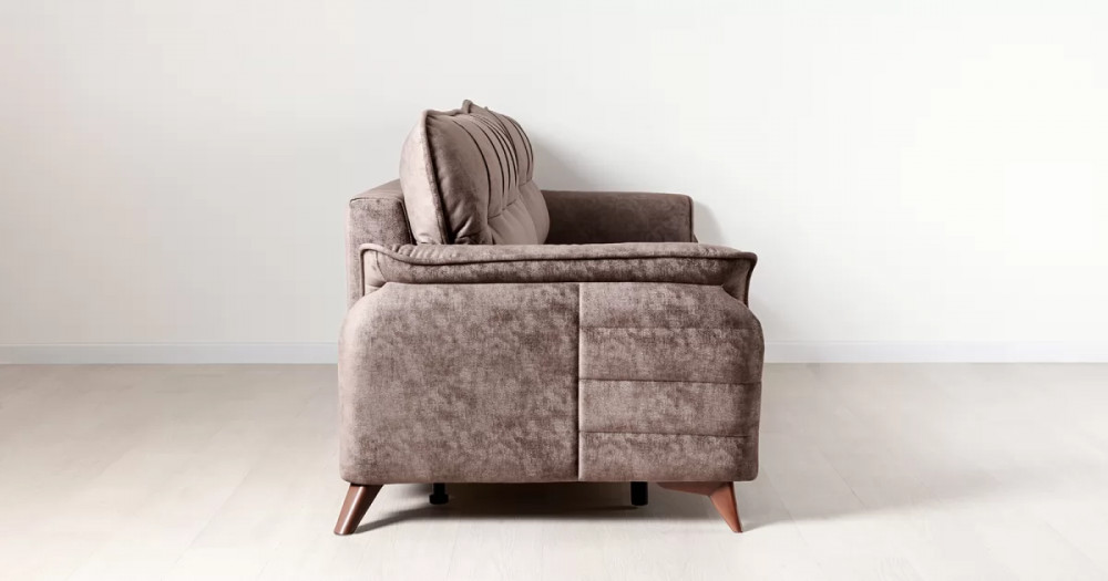 Декоративные канты на подушках дивана, подлокотниках и сиденье. Стежка на передней части сиденья и внешней части подлокотника. Защипы на верхней части подушки. Втяжки с пуговицами на приспинных подушках.