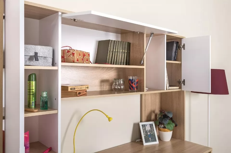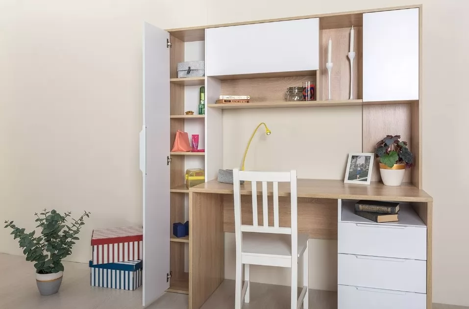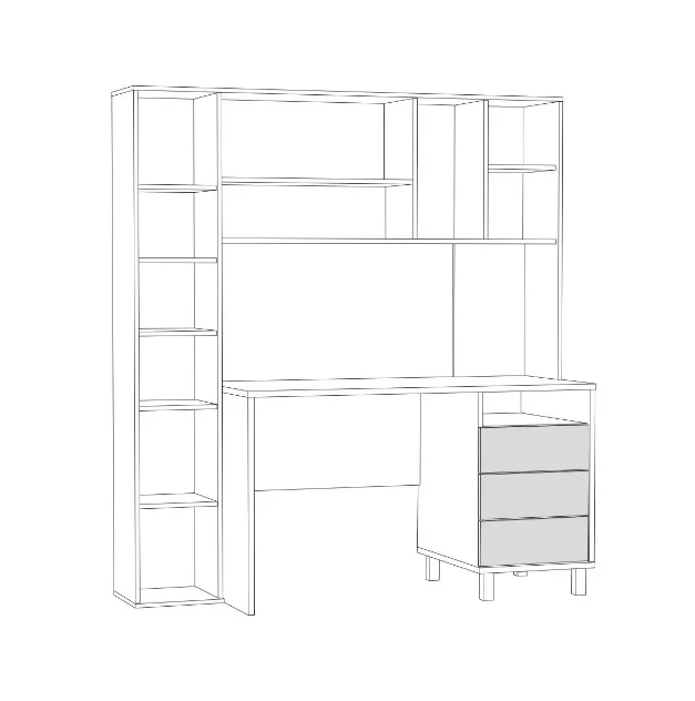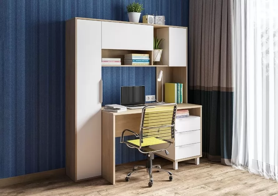 Функциональный и стильный вариант организации рабочего места. Система хранения "Комфорт" №12.95 включает в себя не только удобный стол, но и узкий шкаф-пенал, навесную секцию с несколькими отделениями и тумбу с тремя выдвижными ящиками.