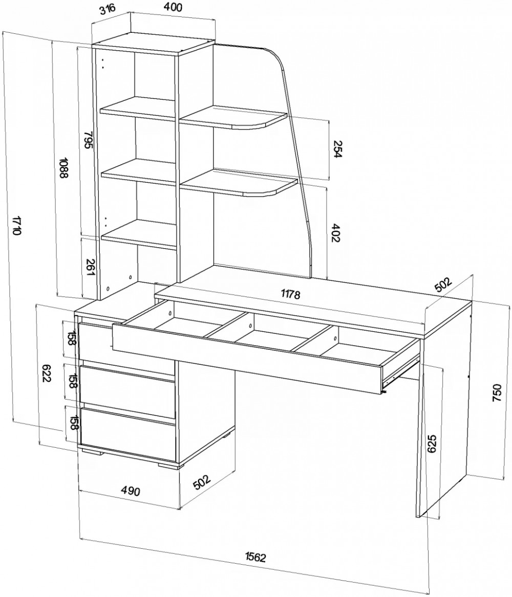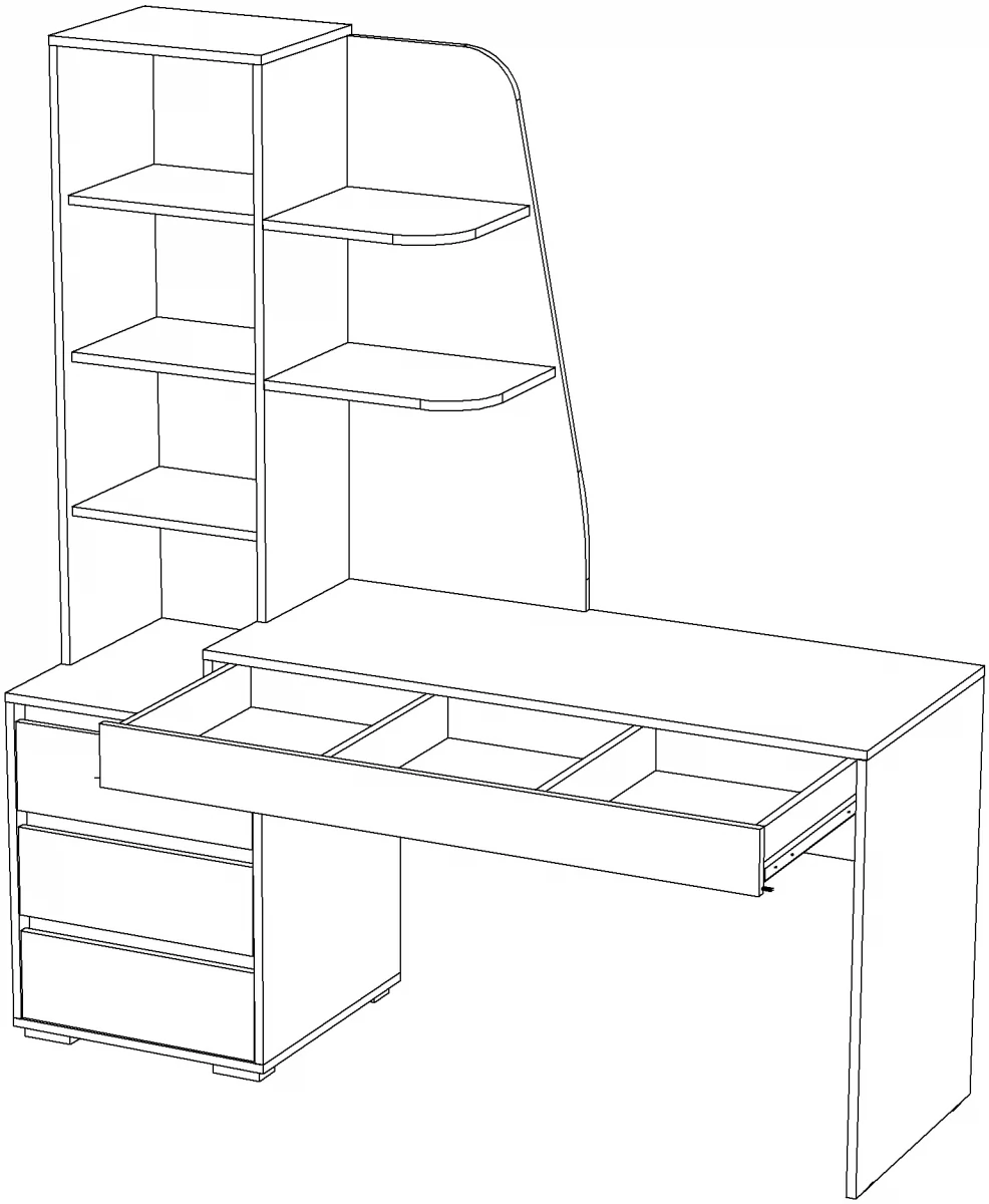• Три ящика в тумбе + Один широкий ящик под столешницей.