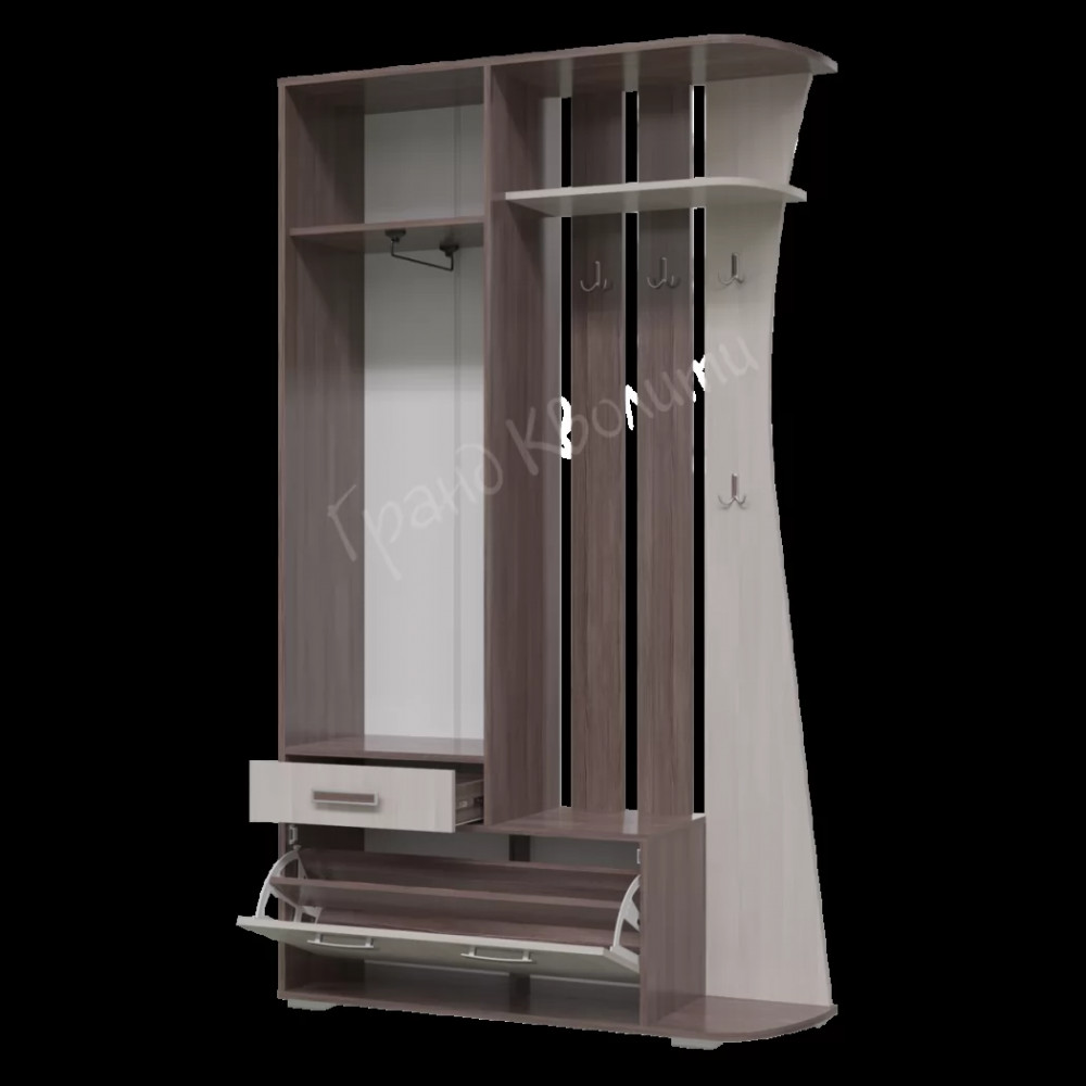 Компактная и стильная прихожая «Мокко» выполнена в трех современных сочетаниях цветов: «Бодега» тёмный/светлый, «Дуб Кельтик». Не смотря на свои компактные размеры, прихожая «Мокко» обладает хорошей функциональностью: штанга и крючки для одежды, выдвижной ящик для мелочей, обувница и две полки.