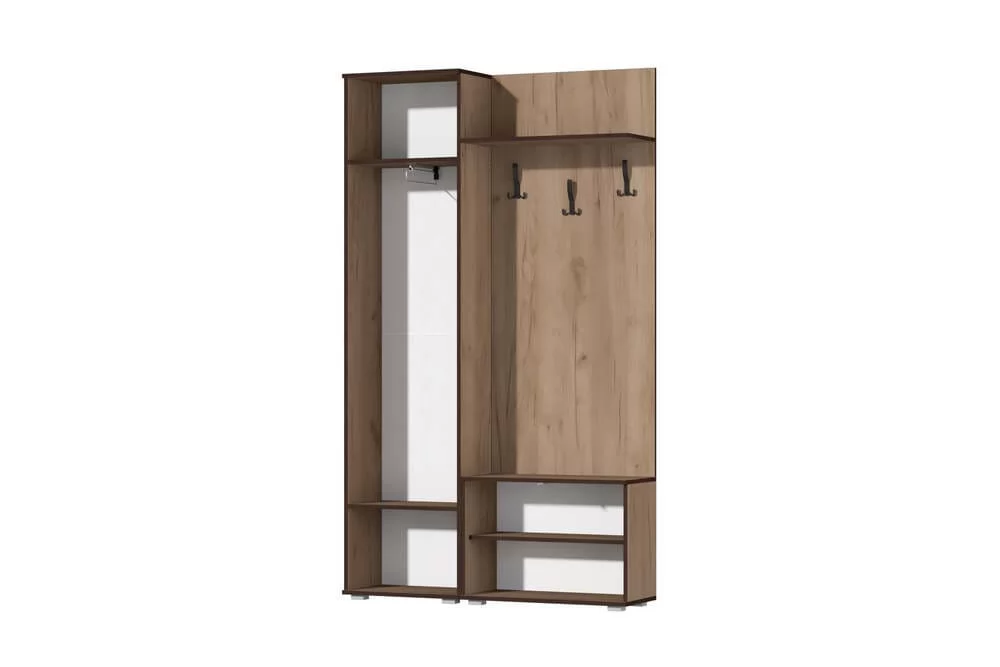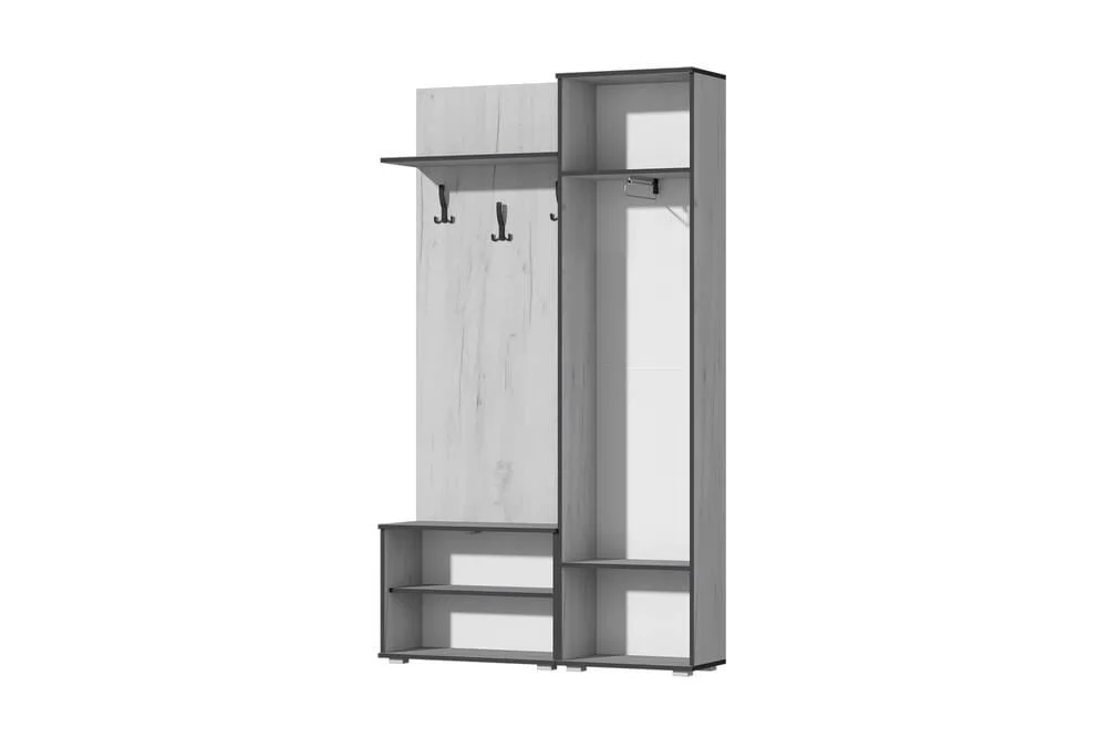Строгая и элегантная прихожая "Норден" идеально подойдет для небольшого пространства Вашего холла. Все детали изделия отделаны контрастной кромкой (крафт золотой-кромка венге; крафт белый - кромка графит), что в сочетании с черными крючками и металлической ручкой подчеркивает модный дизайн данной прихожей. Дверца обувницы открывается при помощи системы push-to-open (нажатием) и секретерного газлифта.