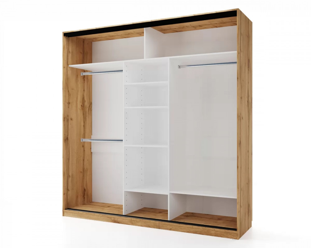 – Шкаф-купе выполнен из ЛДСП цвета Дуб Вотан с белым наполнение внутри (полки/перегородки), что позволяет быстро найти вещи и поддерживать чистоту!