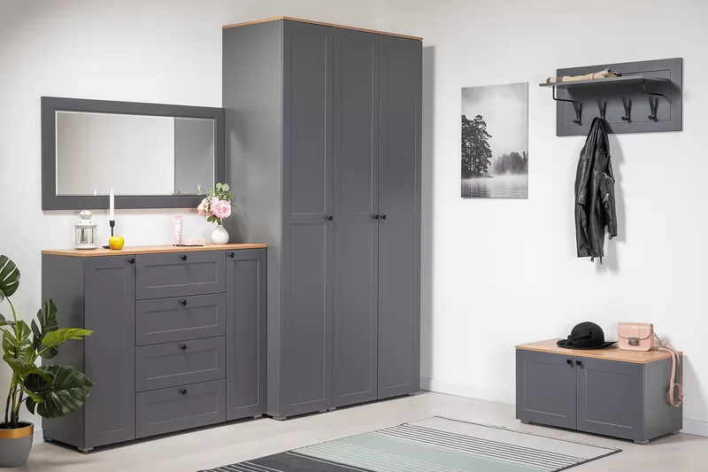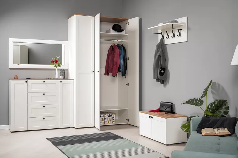 Прихожая доступна в двух цветовых решениях – белый/графит в сочетании с теплым древесным декором.