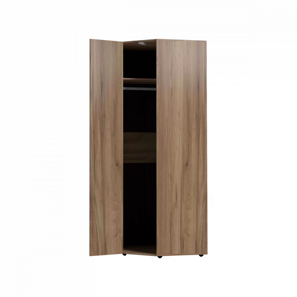 Отлично организовать пространство в маленькой спальне поможет угловой шкаф. Гладкие фасады и натуральный декор шкафа привнесут в комнату особый уют и теплоту. Стационарная штанга и полноценный стеллаж для белья внутри способствуют аккуратной организации вещей. Шкаф оснащен беспроводным светодиодным светильником, который включается при открывании двери. Это особенно удобно, если нужно найти в шкафу вещи, не потревожив близких. Легкая установка на магнитное крепление - не требует сверления, прокладывания провода, подключения к сети. Шкаф обязательно крепится к стене на подвесы, а компенсировать неровности пола можно, благодаря регулируемым опорам.