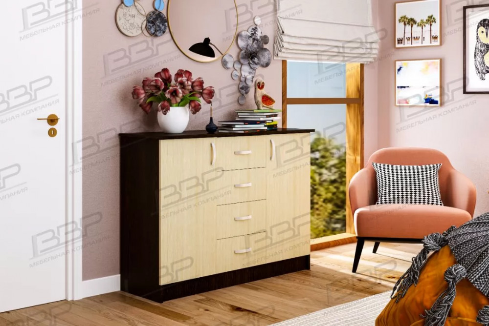 Комод М-03 имеет 4 небольших выдвижных ящика и две распашных дверцы. Фасад и корпус комода изготавливается из ламинированного ДСП