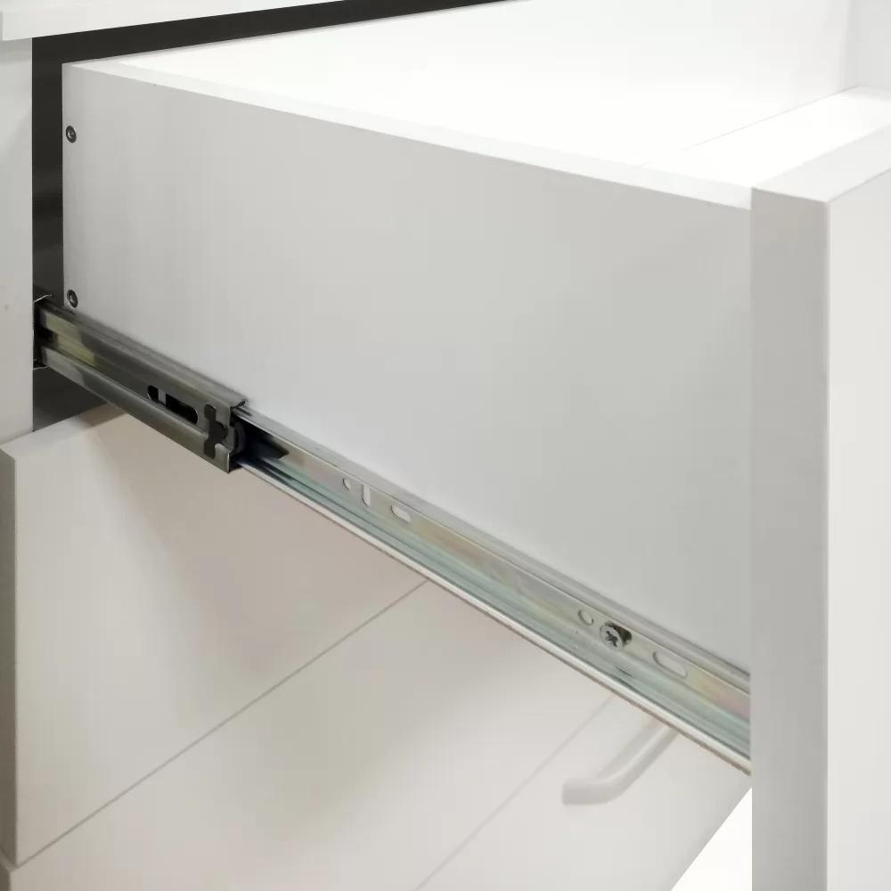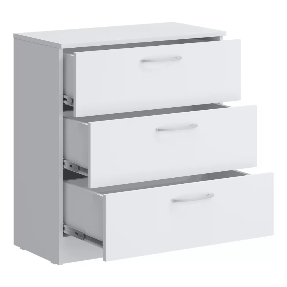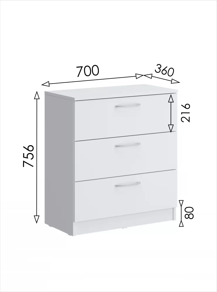 Компактный комод найдёт место даже в небольшом пространстве, сохраняя все преимущества выкатных ящиков. Выкатные ящики работают на шариковых направляющих полного выдвижения - тихие, надёжные, позволяющие увидеть и использовать всё пространство ящика. Белая лаконичная мебель – современный тренд, который позволяет создать лёгкий свежий интерьер. Подойдёт как для светлого интерьера, так и наоборот – для яркого и контрастного, становясь выразительным пятном. Белый цвет не перегружает пространство цветом или текстурой, гармонично дополняя практически любой современный дизайн.