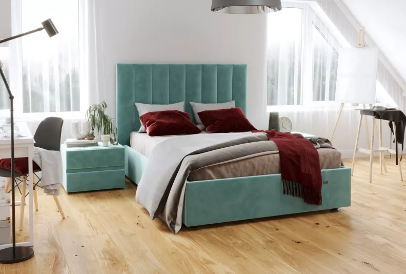 Кровать «Ingrid» подойдет для современных интерьеров спален, впишется в стиль ретро и скандинавский минимализм. Обивка будет отлично сочетаться с любыми цветовыми оттенками отделки и мебели. Кровати выполнены в нейтральных и ярких тканях велюр, что позволяет подобрать подходящий вариант почти под любой интерьер. Изголовье имеет прямоугольную форму, повторяя очертания кровати. Дизайн модели отличается высоким изголовьем с вертикальными строчками и углублениями.