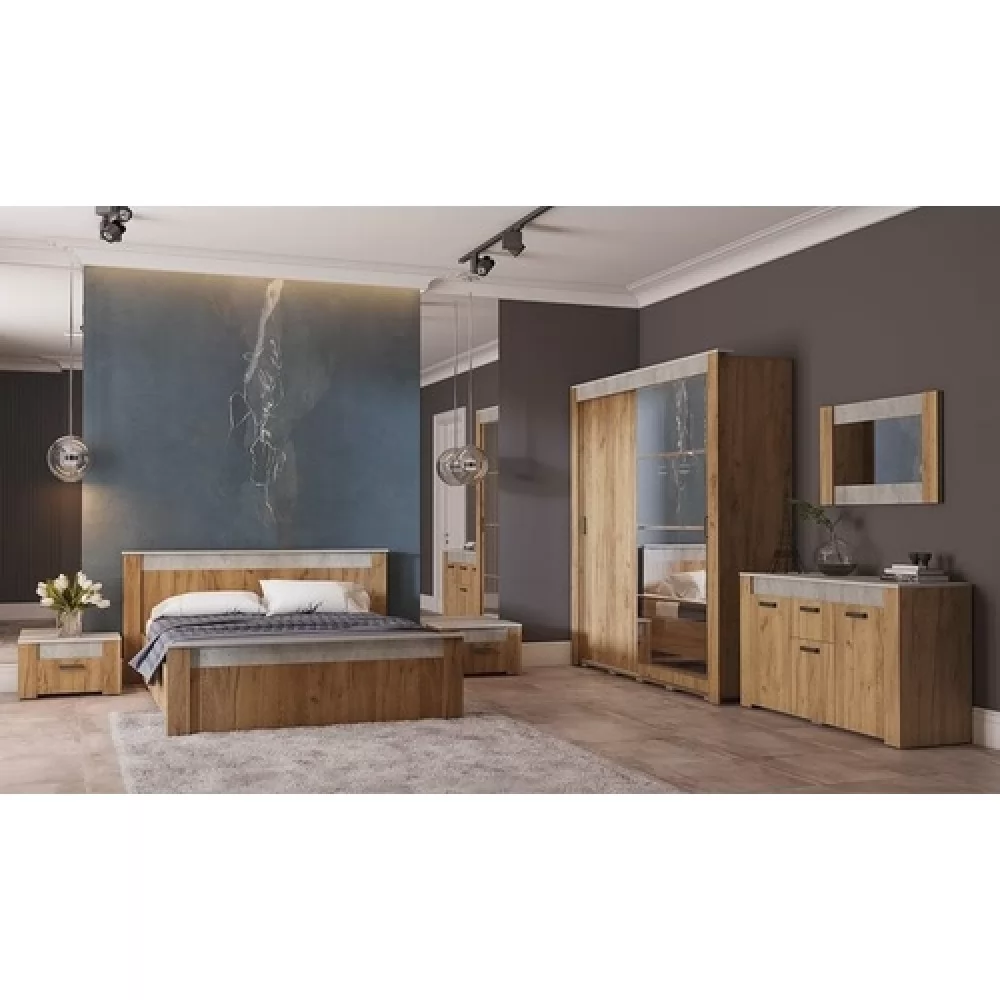 -строгие прямые линии, стильное сочетание двух декоров «Крафт» и «Бетон», несомненно, выделяет данную модель среди других спален.