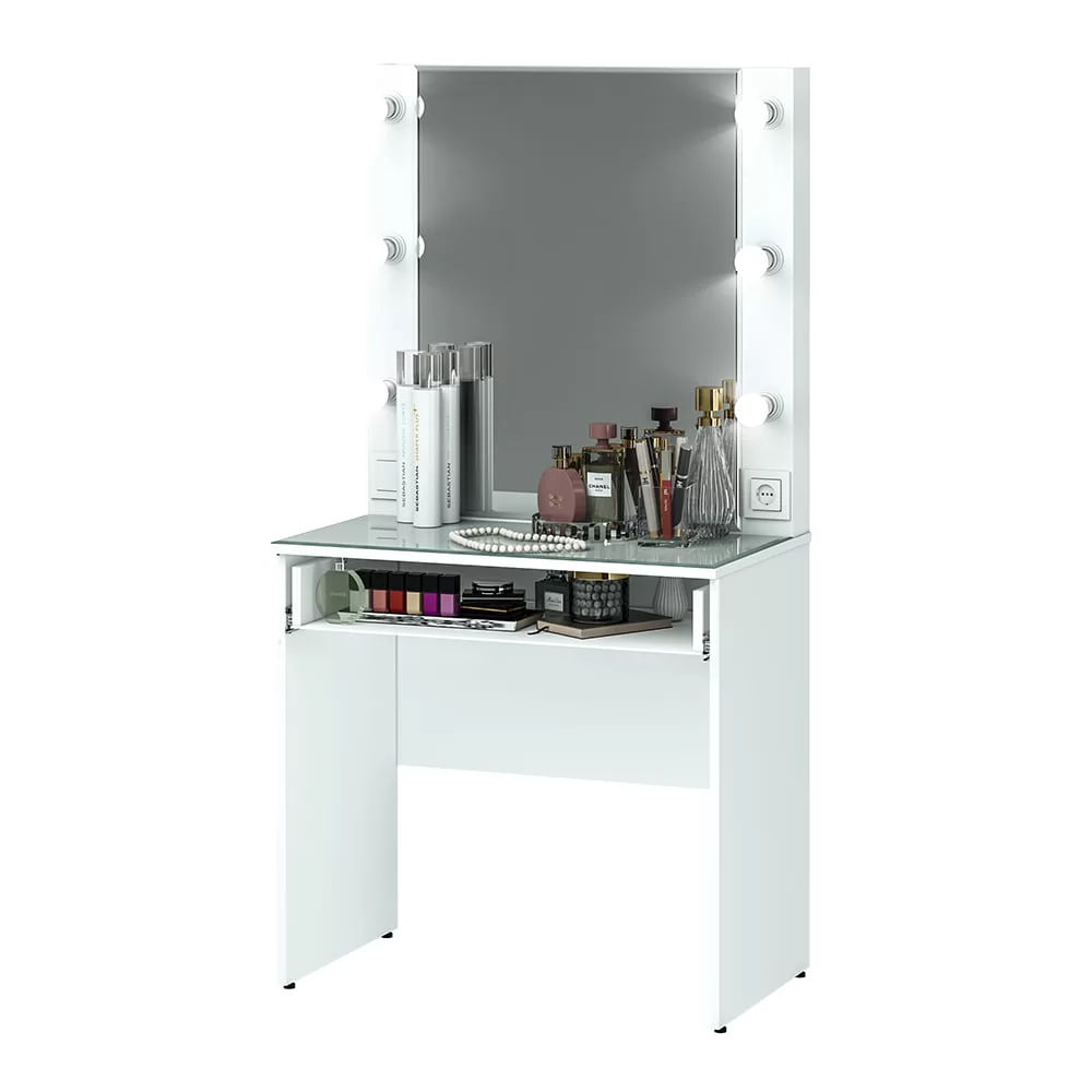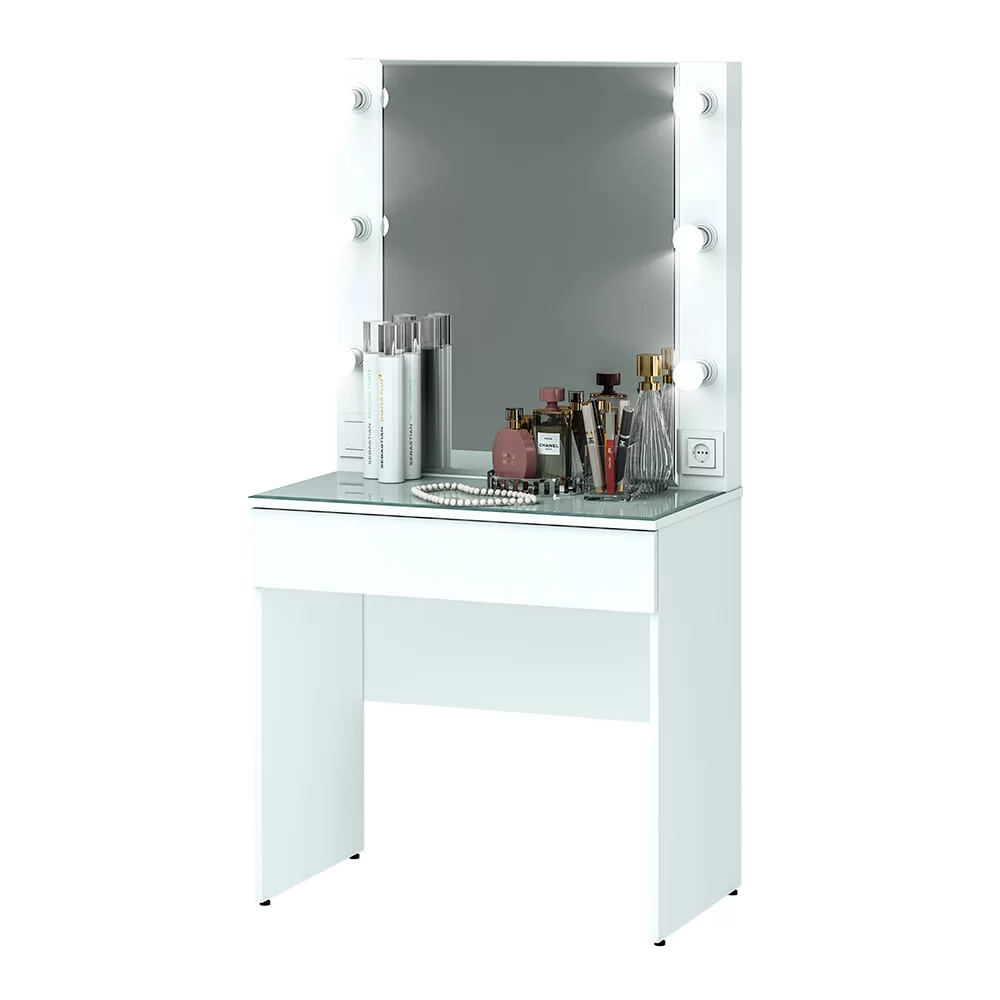 -модель оснащена подсветкой по периметру зеркала, розеткой, съёмной стеклянной столешницей и выдвижным ящиком для всех -необходимых косметических принадлежностей,